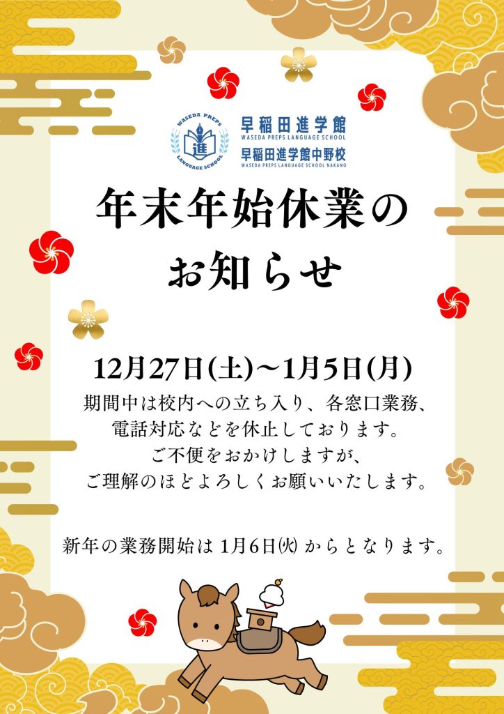 早稲田進学館・早稲田進学館中野校は以下の期間に休業・閉館いたします。